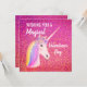 Designed on both sides with pretty bright pink faux glitter sparkles background. The front of card has a big white unicorn with rainbow hair and flowers. "Wishing you a magical Valentine's Day" in white calligraphy script and block lettering. Great for a girl who loves unicorns.