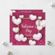 Happy Valentine's Day festive sparkle glitter burgundy dark red background illustration with white realistic 3D hearts and gold foil frame. Text written in modern script letters.
