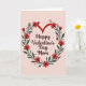 This card shows a soft blush pink background with a heart-shaped wreath of deep green leaves around the center. Scattered through the leaves are small red flowers with lightly outlined petals and darker centers, plus tiny red berries that add extra detail. At the top of the heart sits a shiny red ribbon, folded like a bow where the two sides meet. In the middle, the text reads “Happy Valentine’s Day Mom” in smooth, flowing maroon lettering, placed neatly inside the wreath. The colors feel warm and calm, and the simple heart shape makes the message easy to focus on. It’s a meaningful card to give because it wraps your love and gratitude in a gentle picture that feels caring and close. 🥰❤️