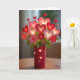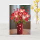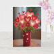 This greeting card shows a still-life bouquet made of glowing hearts and paper flowers, all gathered in a deep red vase. The hearts look translucent and softly lit, shifting from dark red to blush pink, and a few have a light dusting of glitter that catches the light. Between them are simple paper flowers, some lit up too, with bits of greenery peeking through. The vase has small heart-shaped cutouts, and warm light shines through those openings like little windows. The background is softly blurred, like a cozy room, which keeps your attention on the bright bouquet in the center. There isn’t any text on the front, so the design does the talking and leaves room for your own words inside. It feels meaningful to give because it looks like a bouquet that won’t fade, making it a sweet way to say “I’m thinking of you” 🥰❤️.