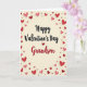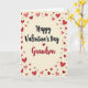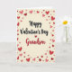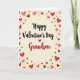This card shows a creamy ivory background with a cluster of red and pink hearts scattered around the message like a loose frame. The hearts range from deep ruby to soft rose, and they look slightly raised, as if they’re gently floating. Near the top center, the words “Happy Valentine’s Day” appear in black, flowing cursive-style lettering that stands out clearly. Just below it, “Grandson” is written smaller in a deep red, in a smooth, flowing letter style that feels tender and personal. A tiny red heart sits near the wording, adding a sweet finishing touch ❤️. The simple layout keeps the focus on love and family, making it easy to picture giving it with a hug or a kind note. It feels meaningful because it says “I’m thinking of you” in a direct, caring way, without needing anything complicated 🥰. Hope it helps you share Valentine’s Day feelings with someone you care about.
