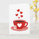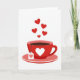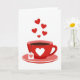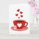This Valentine's Day card shows a bright red teacup sitting on a matching saucer against a plain white background. On the side of the cup, there’s a simple white heart symbol that stands out right away. Inside the cup is a dark drink, and instead of steam, a trail of small red hearts rises up like warm little puffs of love. A teabag hangs off the side, with a thin dark green string and a small tag that also has a tiny heart on it. The saucer has a soft pink-red accent around the rim, adding a gentle touch without taking over the scene. There isn’t any written message on the card—just the heart icons doing the talking. Send it with ❤️💌