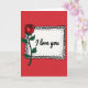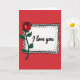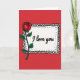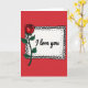 This greeting card shows a deep red background with a large red rose on the left, outlined in black and drawn with simple petal shapes. The green stem curves upward with a couple of small leaves, reaching toward a white rectangle on the right side. Inside that white rectangle, the words “I love you” are written in black cursive-style lettering, centered and easy to read 💘. A line of small black dots runs just inside the rectangle like an inner border. Around the outside edge, a black zig-zag border adds extra detail and makes the message stand out. The whole card feels romantic and direct, using red, white, green, and black to keep the focus on love ❤️.
