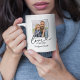 Modern valentines mug featuring 2 photos of a couple for you to replace with your own, the cute saying "love at first swipe", and your names.