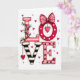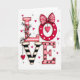 This greeting card features the word “LOVE” displayed as four separate decorative letters on a white background. Each letter has its own unique look, giving the design a hand-crafted feel. The “L” shows soft pink and white stripes, wrapped with curling dark green leaves along the edges. The “O” appears as a red circle covered in polka dots, topped with a red-and-white gingham bow, with a deep red heart hanging below it. The “V” is styled with bold black and white stripes and has another red heart dangling from its point. The “E” is light pink with tiny black stars scattered across it. Extra fuchsia hearts and small black cross marks are sprinkled around the letters, adding detail and warmth. Gentle shading makes the letters appear slightly raised, creating a thoughtful and charming design that’s perfect for sharing love, affection, or Valentine’s Day wishes with someone special.❤️