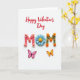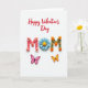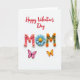 On the front of the card a white background holds a neat flat-lay arrangement that feels calm and loving. Near the top, the text “Happy Valentine’s Day” appears in flowing red cursive-style lettering. Centered below it, the large word “MOM” is made from textured, cut-out letters with flower and bead details. The first “M” is soft coral and decorated with blush-pink daisy shapes and tiny gold beads, giving it a gentle, caring look. The “O” is a layered blue daisy with a bright yellow center, like a little paper flower sitting right in the middle. The last “M” is olive green with small orange blossoms and tiny teal beads, and two butterflies—one fuchsia and one yellow with a red edge—sit nearby as if ready to flutter away. It’s a sweet way to say thanks and love to a mom 🥰❤️, and it’s easy to share Valentine’s Day sentiments with someone who matters.