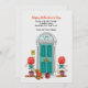 A teal front door with topiary planters on either side and a teddy bear and gift in front. Your address number is on the top of the door. http://www.freepik.com/free-vector/sketchy-british-house-door_800124.htm.