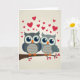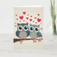 Designed with two sweet owls sitting close together on a dark brown branch, this card sets a tender, romantic mood. The background is a light cream color, which makes the main picture feel calm and open. The owl on the left is a deeper charcoal gray, and the one on the right is a lighter dove gray, so they stand out as a pair. Both owls have big blue eyes with white shine marks and black pupils, giving them a wide-eyed, affectionate look. Their small orange beaks add a warm pop of color against their cool feathers. Red hearts float above and around them, and the branch has red leaves that echo the heart shapes, tying the whole scene together 💘❤️. There isn’t any text shown on the front, so the artwork does all the talking and leaves plenty of room for your own words 😘. Share it to pass along your Valentine’s Day feelings in a simple, caring way.
