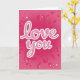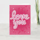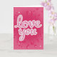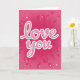 Designed with a bright pink background, this card puts the words “Love You” right in the center in big, rounded lettering. The letters have a striped pink fill, then a lighter pink outline, and a thick white edge that makes the message stand out. Behind the text, the pink backdrop shifts from darker at the top to lighter toward the bottom, with soft diagonal stripes running across it. Small white stars and tiny dots are scattered around, adding a sweet, dreamy feel. You can also see a few simple, curved shapes floating near the words, like little accents that frame the message. Overall, it feels warm, romantic, and easy to give to someone you care about 💕❤️