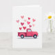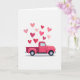 This greeting card shows a classic pickup truck in bright pink on a plain white background, drawn from the side with gentle shading under the wheels. The windows are a light blue, which stands out nicely against the pink body. In the open truck bed, there’s a bunch of heart-shaped balloons floating up, each tied with a thin string. The hearts range from pale pink to hot pink and deep red, and they look like they’re rising into the air with a happy, loving feel 💘. There isn’t any text printed on the front, so the picture does all the talking. The simple background keeps your attention on the truck and the hearts, making it feel sweet and romantic ❤️. It’s an easy way to share Valentine’s Day sentiments with someone you care about.