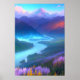 This stunning digital art piece offers a breathtaking view of a beautiful valley from the top of a hill. In the center of the valley, a beautiful river winds its way through the landscape, partly covered in a thin blue mist that creates an ethereal and otherworldly atmosphere.