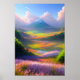 As you walk through the lush valley, your eyes feast on the colorful display that surrounds you. The ground is a carpet of red, pink, and yellow wildflowers, blending with the green grass that stretches as far as the eye can see. Above, the sky is a brilliant blue, the perfect canvas for the sun to paint its warm glow across the landscape. In the far distance, a towering mountain stands majestically, its snow-capped peak piercing the clouds. As you take in the stunning vista, you feel a sense of peace and awe at the beauty of nature.