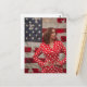 The image depicts a confident woman standing. a Kamala Harris look-a-like in front of a large American flag. She is dressed in a striking red polka dot blazer, which adds a vibrant and stylish touch to her appearance. Her hands are placed on her hips, and she gazes off to the side with a composed and determined expression. The flag in the background, with its stars and stripes, provides a patriotic backdrop, emphasizing themes of national pride and leadership. The overall composition of the image conveys strength, confidence, and a sense of purpose.