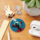 Cute goth personalized keychain with a digital illustration of a funny dark skinned undead character with glowing eyes, blue hair, fans and vibrant red cape over dark blue background. Fun design great for Halloween.