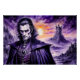 vampire warrior stands amidst the ruins of a destroyed city, holding a sword under a full moon, with mist and smoke surrounding.