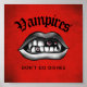 Vampire poster with the funny text Vampires Don't Do Dishes and an original artwork of a vampire mouth with fangs and broken teeth, evil creatures lurking behind in the dark and red grunge textured background. Great design for Halloween and for fans of the gothic style with a sense of humor.