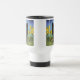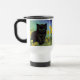 Travel Mug featuring a black cat in the style of Van Gogh! A fluffy black kitty sits next to yellow flowers against a green and blue background. A fun gift for cat lovers and Dutch art collectors!