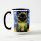 Coffee Mug featuring a Siamese cat in Van Gogh’s painting Starry Night! This fluffy beauty poses in front of a blue night sky with shining moon and stars. A cozy gift for cat lovers and Dutch art collectors!