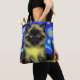 Tote Bag featuring a Siamese cat in Van Gogh’s painting Starry Night! This fluffy beauty poses in front of a blue night sky with shining moon and stars. A cozy gift for cat lovers and Dutch art collectors!
