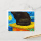Postcard featuring a Van Gogh cat in the style of Starry Night! A fluffy black kitten perches on a table against a blue night sky and yellow moon. A purr-fect gift for cat lovers and Dutch art collectors!