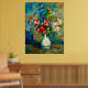 A vase of colorful flowers sits prominently, exhibiting vivid reds, blues, and yellows. The background is an intricate melange of textured brush strokes.