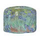 This beautiful pouf is inspired by Irises painted by Vincent van Gogh in 1889. The image boasts blue irises with green stems and leaves with pointy tips planted in the red-brown earth.
