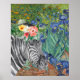 Beautiful and artistic compilation features Vincent Van Gogh's Irises fine art painting as a backdrop to an adorable watercolor zebra with a fancy crown of flowers.
