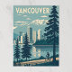 a retro postcard of Vancouver, Canada. Include the skyline with high-rise glass buildings, backed by the North Shore Mountains. Add Stanley Park’s evergreen trees and a cyclist on the seawall path in the foreground. Include reflections in the water of Burrard Inlet. Use teal, navy, and forest green color tones with crisp vectors and geometric stylization. Highlight the city’s clean, modern feel with vintage flair."