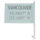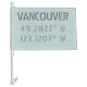 Claim your spot in the world with this car flag that features latitude and longitude coordinates for Vancouver, B.C.. Modern, urban font in grey on blue background