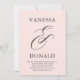 Modern wedding save the date card featuring a simple and minimal layout with your names and an elegant ampersand in a large format above your event details. The color theme is blush pink and gray and may be changed in the design editing tool.