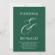 Modern wedding save the date card featuring a simple and minimal layout with your names and an elegant ampersand in a large format above your event details. The color theme is emerald green and may be changed in the design editing tool.