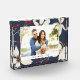 Elegant holiday keepsake photo block features your favorite photo against a navy blue background adorned with pale ivory winter flowers and red berries. Personalize with your custom caption; we love it with your names and the year.