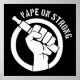 An encircled, stylized clenched fist holding a vaping mod, with the stenciled words "Vape On Strong" on the side. A message to fellow vapers who persevere and fight negativity with knowledge and information.
