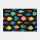 Various colorful tropical fish graphics on black background, seamless repeat pattern