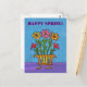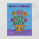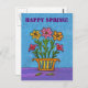 Image is from my original painting. These colorful folk art flowers are sitting in a blue and yellow vase on a purple table. The background is done in multiple blues. Two leaves are laying on the table. The text reads Happy Spring. See my store Art by MAR for matching products with this design.