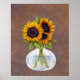 Poster with a vase of three beautiful sunflowers on a grungy, rustic brown background.