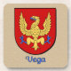 Hispanic surname Vega historical family shield set of Coasters on a parchment style background.