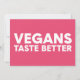 This graphic features bold, pink typography stating “VEGANS TASTE BETTER” prominently. The design employs a modern, eye-catching font that emphasizes the positive message about veganism. The bright color scheme and strong text create an engaging visual, appealing to those who appreciate or promote plant-based lifestyles. This piece can serve as a slogan for a vegan campaign, restaurant, or awareness initiative