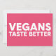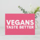 This graphic features bold, pink typography stating “VEGANS TASTE BETTER” prominently. The design employs a modern, eye-catching font that emphasizes the positive message about veganism. The bright color scheme and strong text create an engaging visual, appealing to those who appreciate or promote plant-based lifestyles. This piece can serve as a slogan for a vegan campaign, restaurant, or awareness initiative