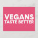 This graphic features bold, pink typography stating “VEGANS TASTE BETTER” prominently. The design employs a modern, eye-catching font that emphasizes the positive message about veganism. The bright color scheme and strong text create an engaging visual, appealing to those who appreciate or promote plant-based lifestyles. This piece can serve as a slogan for a vegan campaign, restaurant, or awareness initiative