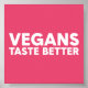 This graphic features bold, pink typography stating “VEGANS TASTE BETTER” prominently. The design employs a modern, eye-catching font that emphasizes the positive message about veganism. The bright color scheme and strong text create an engaging visual, appealing to those who appreciate or promote plant-based lifestyles. This piece can serve as a slogan for a vegan campaign, restaurant, or awareness initiative