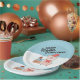 These Vegan Christmas paper plates feature a nice cartoon piglet with a red hat and scarf and some colorful presents, on a snowy background.