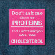 This minimalist fun button, featuring the wording "Don't ask me about my proteins and I won't ask you about your cholesterol" in white lettering on a pink background, is the perfect gift for every vegan.