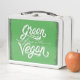 A white metal lunchbox with a black handle and a silver latch is displayed against a neutral background. The front of the lunchbox features a green panel with the words "Green Fresh Vegan" written in a stylized, cursive white font. The green panel has a slightly distressed or textured appearance, with darker edges that give it a vintage or chalkboard-like effect. The white lettering is ornate, with flourishes and swirls that add to the design's visual appeal. The lunchbox itself has rounded edges and a glossy finish, reflecting light and giving it a clean, modern look. The handle is made of black plastic with a textured grip, and the silver latch is simple and functional. The overall composition is clean and well-lit, with a focus on the lunchbox and its design.