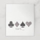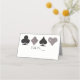 Perfect for a glamorous and glitzy Las Vegas casino wedding, this white folded place card features faux silver glitter with black card suits, a pre-printed space to write in table numbers and a blank white space to write in your guests names. Does your caterer need to know each guest's meal choice? Edit this design to add a colored backer unique to each meal type or use a sticker to denote who gets what type of meal. These cards are sold in packs of 25 so don't forget to order enough for each place setting!