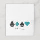 Perfect for a glamorous and glitzy Las Vegas casino wedding, this white folded place card features faux teal glitter with black card suits, a pre-printed space to write in table numbers and a blank white space to write in your guests names. Does your caterer need to know each guest's meal choice? Edit this design to add a colored backer unique to each meal type or use a sticker to denote who gets what type of meal. These cards are sold in packs of 25 so don't forget to order enough for each place setting!
