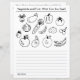 Worksheet on 2 sides. Side one has illustrations of various vegetable and fruit, plus space where a pupil can write the names of the items they an identify. They can also color the illustrations. On side two, schoolchildren are invited to draw their own vegetables and fruit.