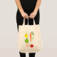 This reusable grocery tote features a fruit and vegetable design. Customize this tote with your name.