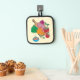 A lovely light yellow pot holder for your kitchen featuring some fresh vegetables on a wooden cutting board and a blue bowl of steaming soup .