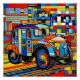 The A.I. created surreal interpretation of stylized vibrant surreal vehicle or vehicles with wheels stand within an abstract. geometric patterned landscape.